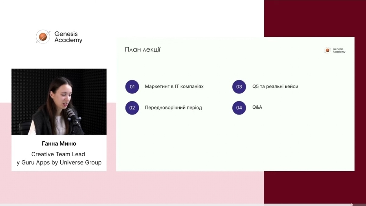 4 грудня 2025 року викладачі та студенти кафедри маркетингу Уманського національного університету долучилися до актуального та пізнавального заходу – відкритої лекції на тему «Інсайти performance-маркетингу в передноворічний період». Цей захід став чудовою нагодою для академічної спільноти університету зануритися у тонкощі практичного маркетингу, особливо в один із найдинамічніших та найконкурентніших періодів року. Своїми знаннями та практичним досвідом з учасниками поділилася Ганна МИНЮ, Creative Team Lead у компанії Guru Apps by Universe Group. Ганна МИНЮ розкрила ключові аспекти, на які необхідно звернути увагу маркетологам при плануванні та реалізації performance-кампаній напередодні Різдва та Нового року.