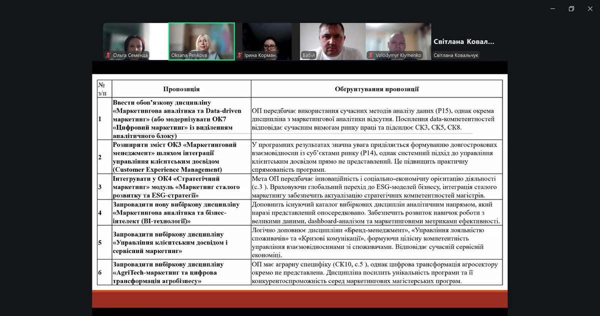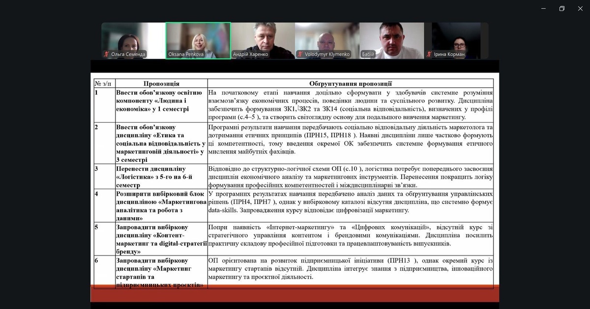 Під час засідання було здійснено ґрунтовний розгляд пропозицій, поданих різними групами стейкхолдерів. Учасники обговорили напрями вдосконалення структури освітніх програм, актуалізацію освітніх компонентів, посилення практичної складової підготовки майбутніх маркетологів, розвиток цифрових компетентностей, а також інтеграцію соціально-етичних аспектів маркетингової діяльності у зміст навчання.