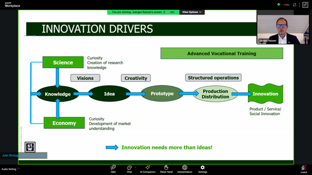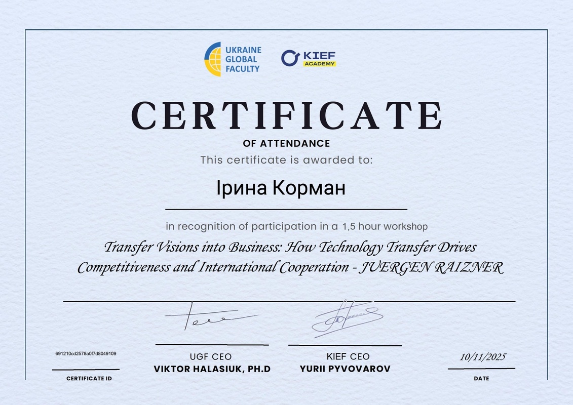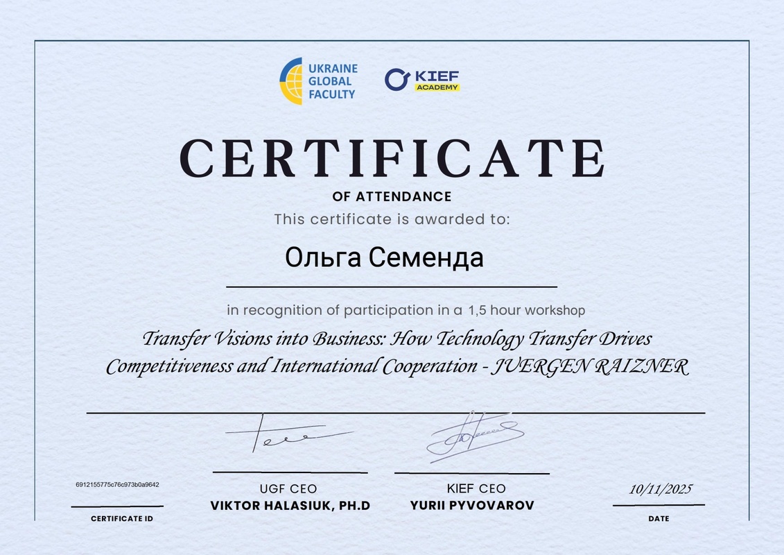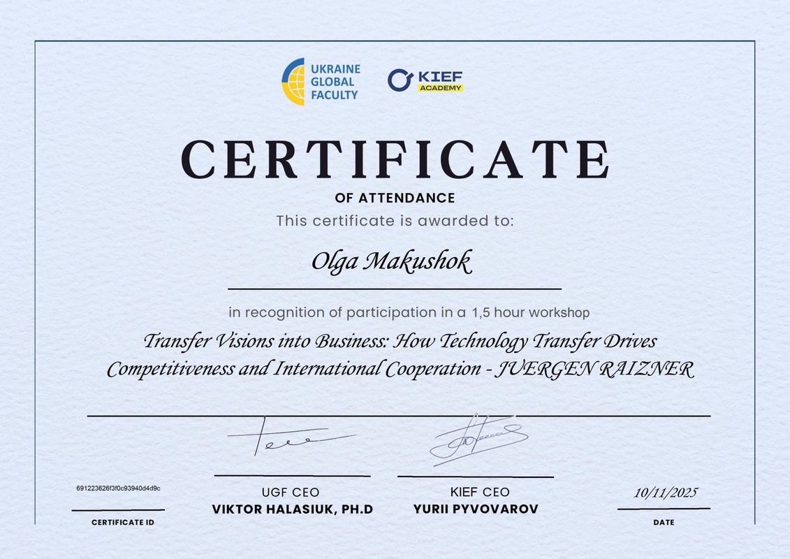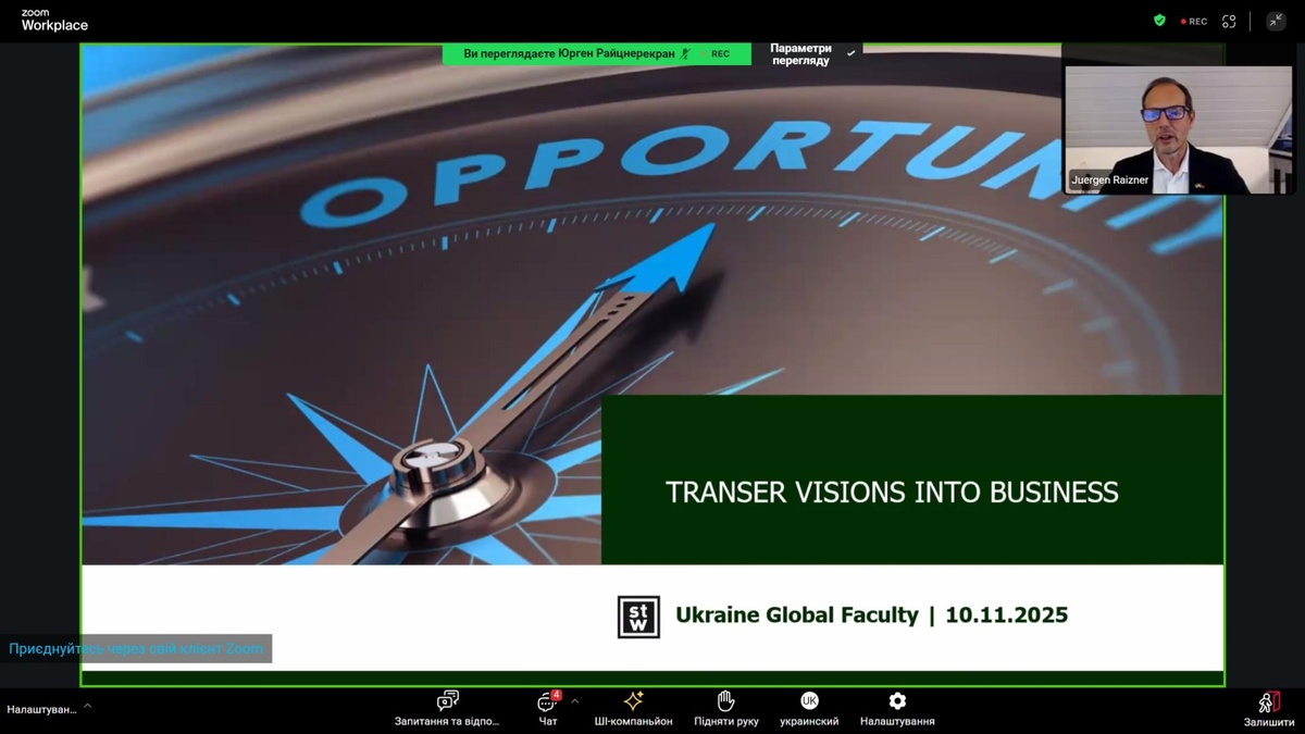 10 листопада 2025 року науково-педагогічні працівники кафедри маркетингу Уманського національного університету долучилися до онлайн-семінару «Трансформація ідей у бізнес: як трансфер технологій сприяє конкурентоспроможності та міжнародній співпраці». Захід відбувся на міжнародній освітній платформі Ukraine Global Faculty і зібрав фахівців, зацікавлених у посиленні інноваційного потенціалу. Спікером виступив Юрген РАЙЦНЕР, директор Steinbeis Enterprises та визнаний експерт із трансферу технологій і міжнародної співпраці.