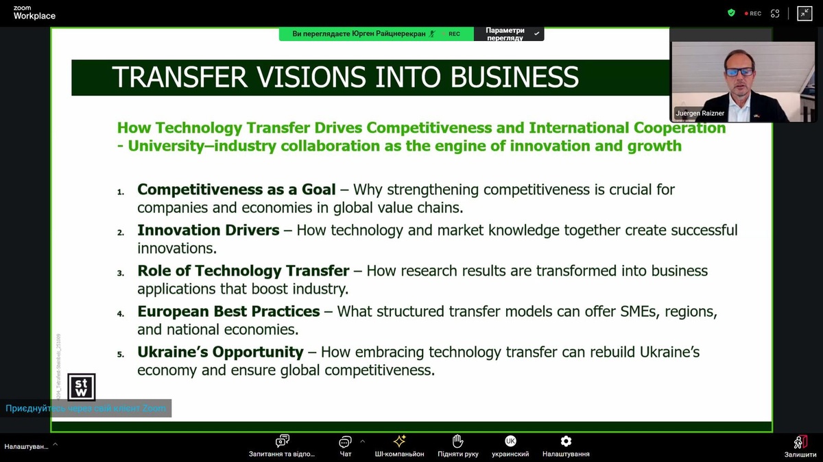 Під час онлайн-зустрічі були розглянуті такі важливі аспекти: чому посилення конкурентоспроможності є надзвичайно важливим для компаній та економік, що прагнуть успіху у глобальних ланцюгах створення вартості; як успішне поєднання технологій та глибоких знань про ринок сприяє створенню успішних та затребуваних інновацій; механізми, завдяки яким результати наукових досліджень можуть бути трансформовані в готові бізнес-розробки, стимулюючи розвиток промисловості; кращі європейські практики та приклади того, що структуровані моделі трансферу технологій можуть запропонувати малому та середньому бізнесу (МСП), регіональним і національним економікам; стратегічне значення впровадження ефективної системи трансферу технологій для відновлення економіки України та забезпечення її глобальної конкурентоспроможності.