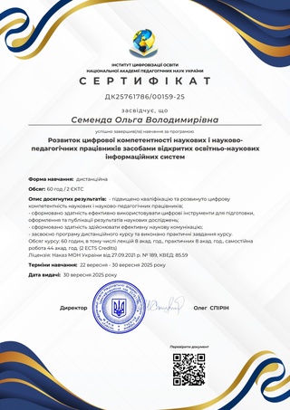 Ольга Семенда, доцент кафедри маркетингу Уманського національного університету, успішно завершила навчання за програмою підвищення кваліфікації в Інституті цифровізації освіти Національної академії педагогічних наук України. Протягом 22-30 вересня 2025 року вона проходила дистанційний курс «Розвиток цифрової компетентності наукових і науково-педагогічних працівників засобами відкритих освітньо-наукових інформаційних систем». Успішне завершення програми засвідчено сертифікатом (№ ДК 25761786/00159-25), що підтверджує досягнення ключових компетентностей у сфері цифровізації наукової та освітньої діяльності.