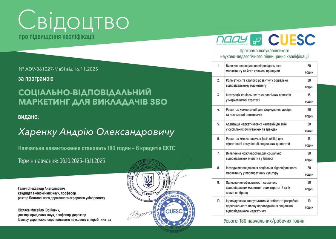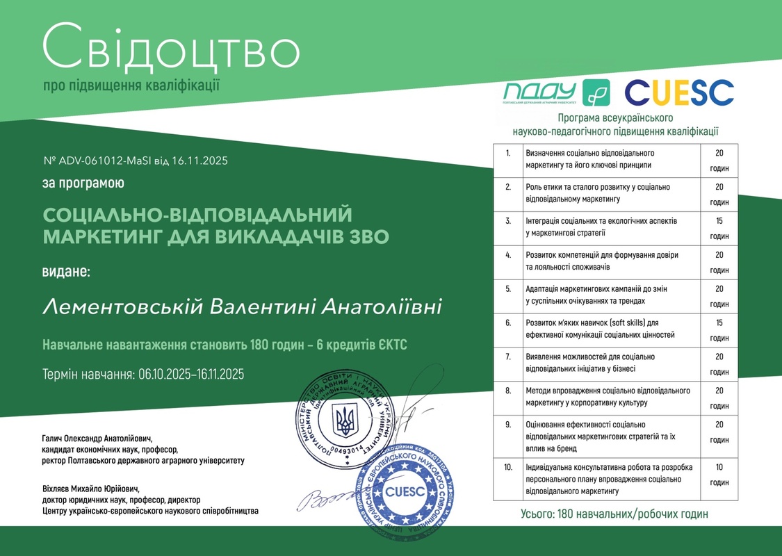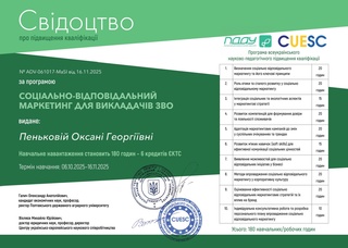 З метою реалізації зазначених завдань щодо озброєння здобувачів вищої освіти ґрунтовними та актуальними знаннями у сфері соціально відповідального маркетингу науково-педагогічні працівники кафедри маркетингу Уманського національного університету Оксана ПЕНЬКОВА, Андрій ХАРЕНКО, Тетяна БОРТНИК та Валентина ЛЕМЕНТОВСЬКА пройшли програму всеукраїнського науково-педагогічного підвищення кваліфікації «Соціально-відповідальний маркетинг для викладачів ЗВО», організовану Центром українсько-європейського наукового співробітництва спільно з Полтавським державним аграрним університетом. У межах програми учасники опанували ключові підходи до формування та впровадження соціально відповідальних маркетингових стратегій, інтеграції соціальних і екологічних аспектів у маркетингову діяльність, розвитку етичних компетентностей та оцінювання ефективності соціально орієнтованих маркетингових рішень.
