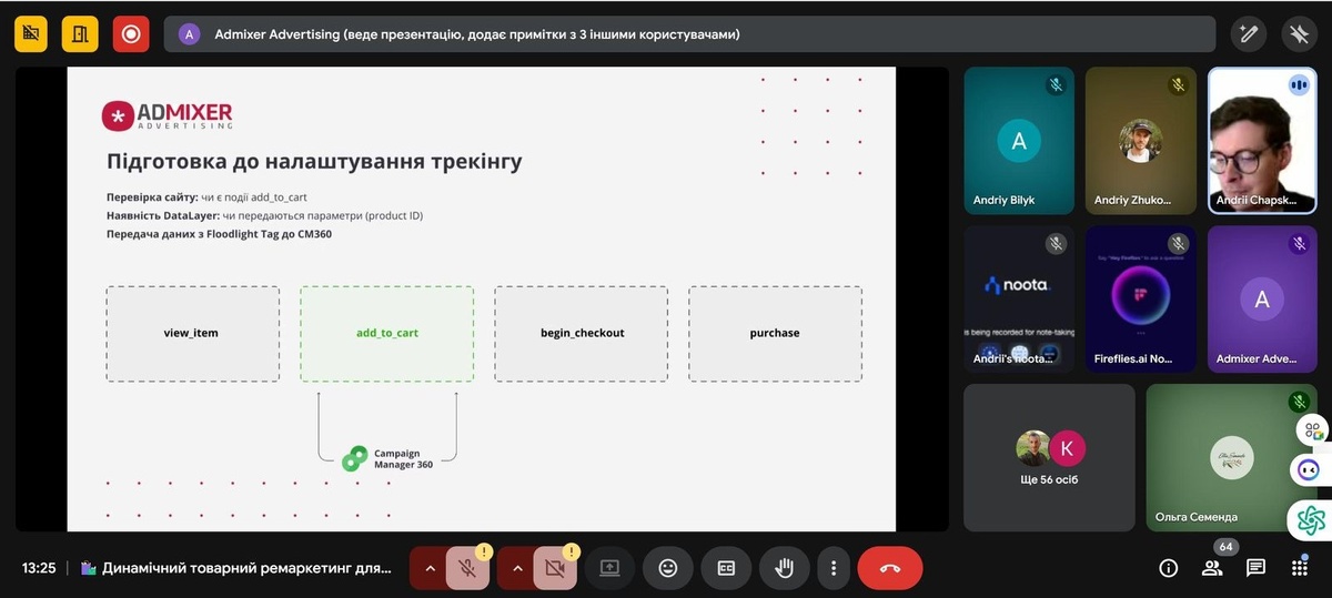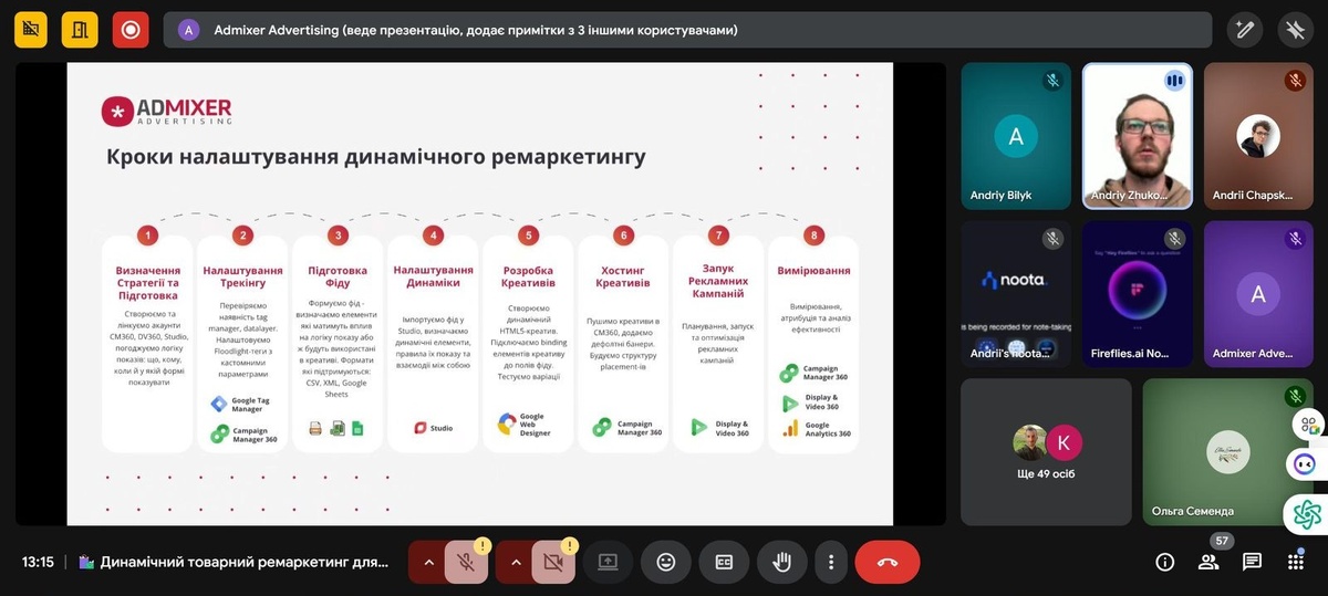 Захід охопив широкий спектр важливих тем: сутність динамічного товарного ремаркетингу та його роль в eCommerce, можливості та переваги технології для онлайн-бізнесу, покрокові етапи запуску динамічного ремаркетингу в Google Marketing Platform, інтеграція продуктів Display & Video 360, Campaign Manager 360 та Studio, методи вимірювання ефективності рекламних кампаній, успішні кейси українських інтернет-магазинів, практичні рекомендації від експертів, AI-рішення від Admixer Advertising для роботи з eCommerce, інтерактивна сесія питань та відповідей